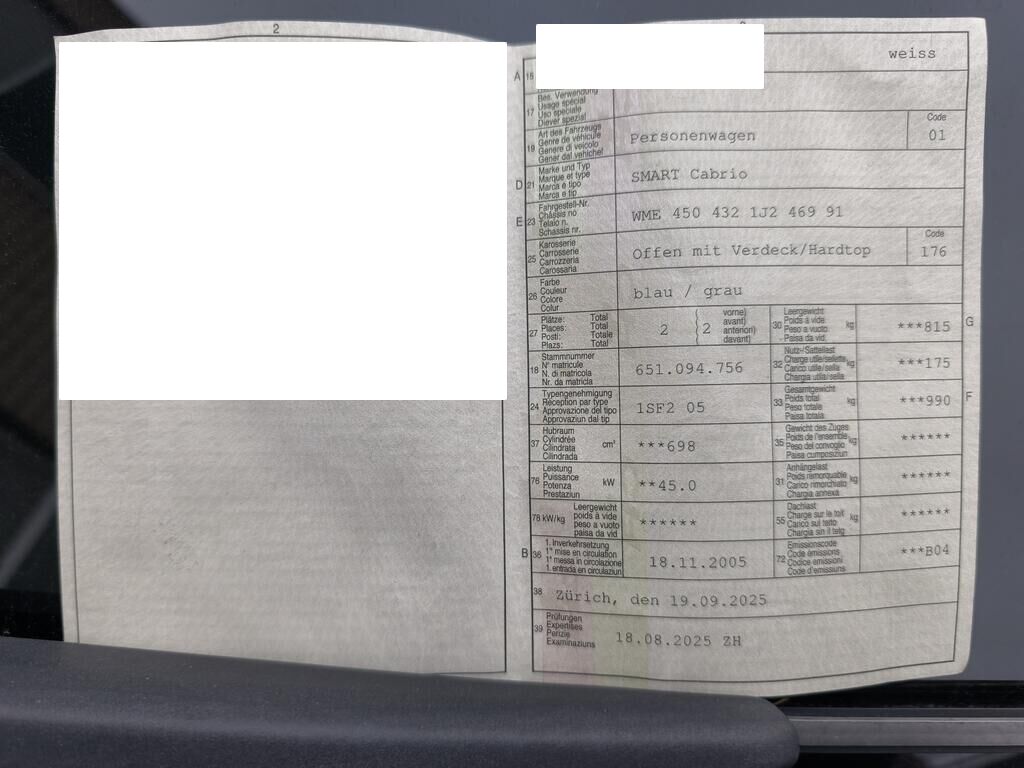 | nur ein Schlüssel vorhanden Faltdach leicht beschädigt | |