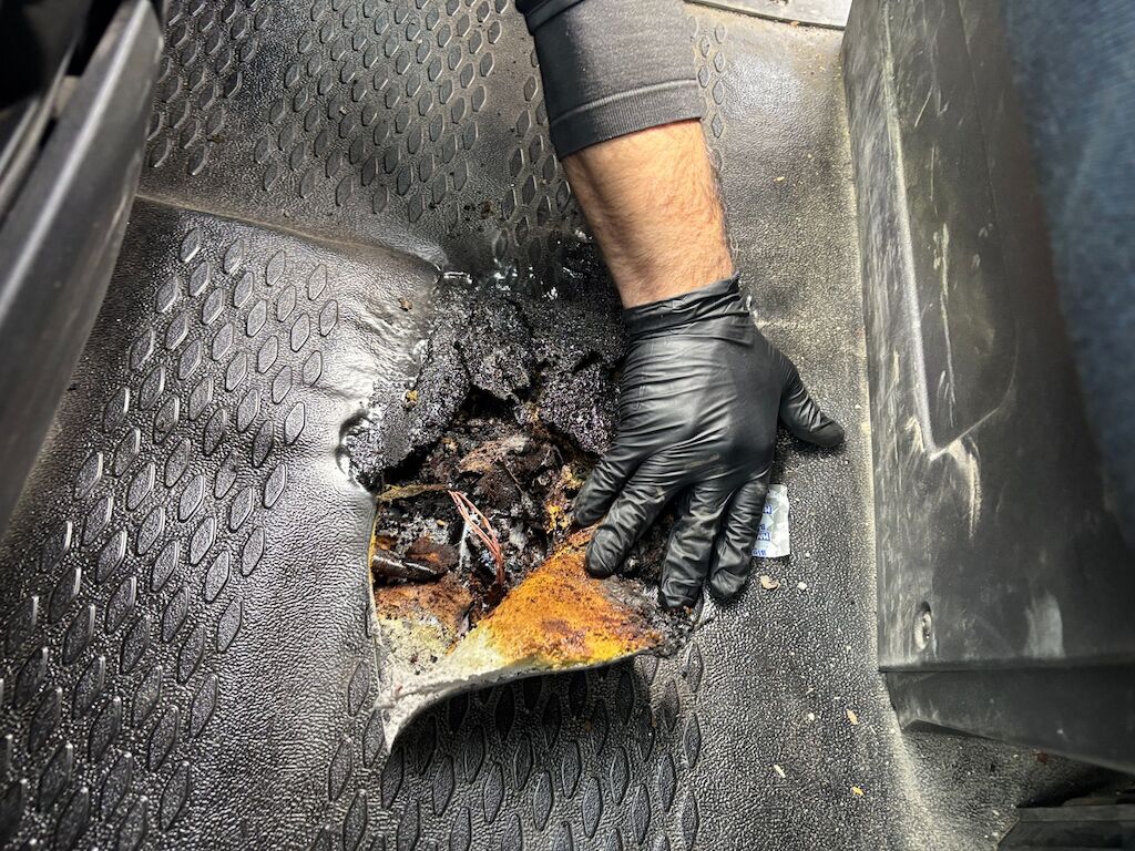 | Opis uszkodzen: | Brandschaden mit Beschädigung von: Kabinenboden, Kabelstränge, Sensoren Auspuffanlage, Risiko Steuergeräte, Motor läuft, Kombiinstrument ohne Funktion |