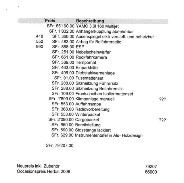 | Sonderausstattung: | 13412 CHF | Reparaturkosten: | 25500 CHF |