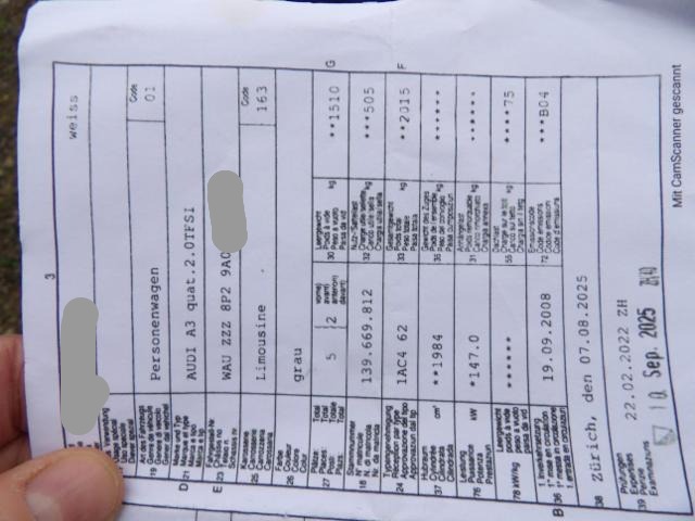 Wichtige HinweiseZustandFahrzeug muss transportiert werden [Höhe und Breite beachten]. Fahrzeug ist NICHT fahrbar. Bereifung Fahrzeug wird mit Winterräder abgegeben. Schlüssel Nur ein Schlüssel vorhanden. BeschädigungenLinks Linke Seite beschädigt. Anstoss links im Bereich der C-Säule. Schweller links ist eingedrückt. Tür vorne links ist eingedrückt. Tür hinten links ist eingedrückt. Heck Seitenwand hinten links eingedrückt/ausgestaucht. Motor Risiko Motor. Risiko Getriebe. Sonstige Schäden Div.Carrosserie Teile sind leicht beschädigt. Weitere Beschädigungen Motor konnte nicht gestartet werden, Motor dreht leer durch, vermutlich Kette gerissen. AusstattungSerienaustattung Fahrer-Informationssystem FIS Sonnenschott für Heckscheibe Beifahrersitz höhenverstellbar Sportfahrwerk Aussenspiegel elektrisch verstellbar und heizbar Radio Chorus Airbag Fahrer und Beifahrerseite Seitenairbag Fahrer und Beifahrerseite Zentralverriegelung mit Fernbedienung Elektronische Wegfahrsperre Geteilte Rücksitzlehne 1/3, 2/3 Lenksäule mit Höhen- und Längseinstellung Elektrische Fensterheber vorne ESP/ ASR/ EDS/ ABS mit EBV Seitliches Kopfairbagsystem SIDEGUARD Aussenspiegel in Wagenfarbe Vordersitze höhenverstellbar Wärmeschutzverglasung Audi hill hold assist [Berganfahrassistent] Servotronic geschwindigkeitsabhängig Nebelscheinwerfer vorne Leichtmetallräder 17" Keine Gewähr auf die Angaben der Serienausstattungen SonderausstattungLendenwirbelstützen elektr. für Vordersitze Innenspiegel auto.abbl./auto.Fahrlichtsch./Regens./come-home Innenbeleuchtungspaket Mittelarmlehne vorne Tempostat Ablagepaket Scheinwerfer Waschanlage CD-Wechsler im Handschuhfach Dachhimmel schwarz/ Stoff Dekoreinlagen in Aluminium medial silber Klimaautomat/ Aussentemperaturanzeige Frontscheibe mit grauem Colorstreifen Leichtmetallräder 17" 5-Arm Design Parklenkassistent |