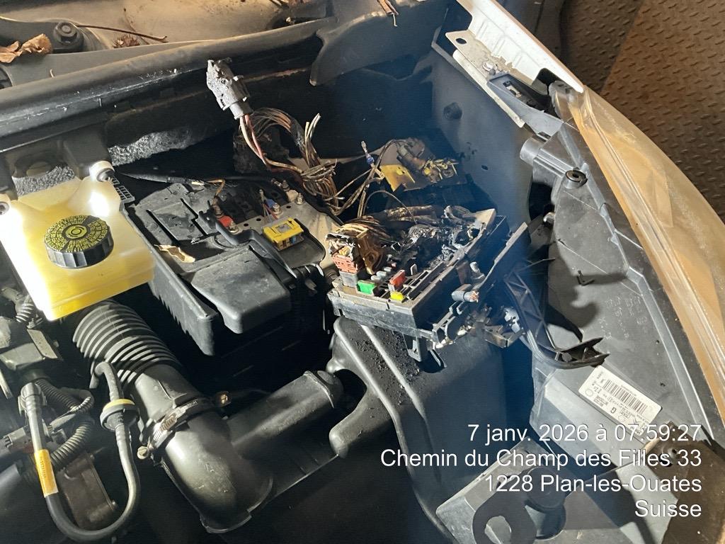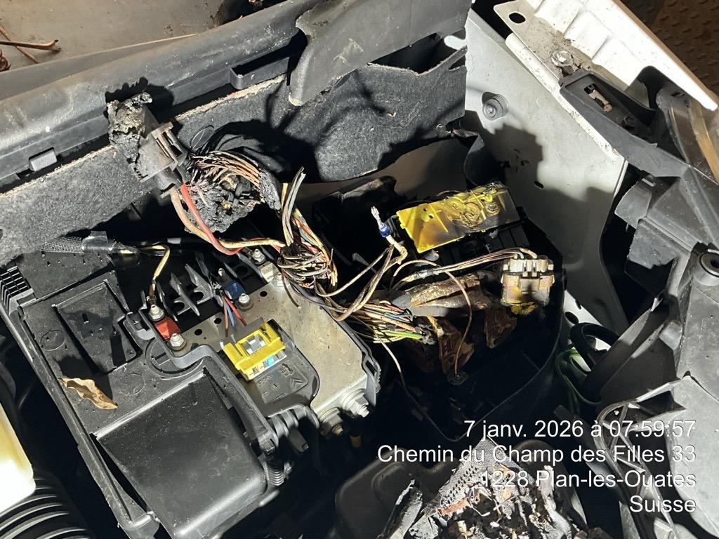 | Schadensbeschreibung | Beschreibung der Schäden: Incendie: boite à fusible, calculateur, faisceau habitable, faisceau moteur Vorbestandene Schäden: Hinten mitte: PORTES AR |