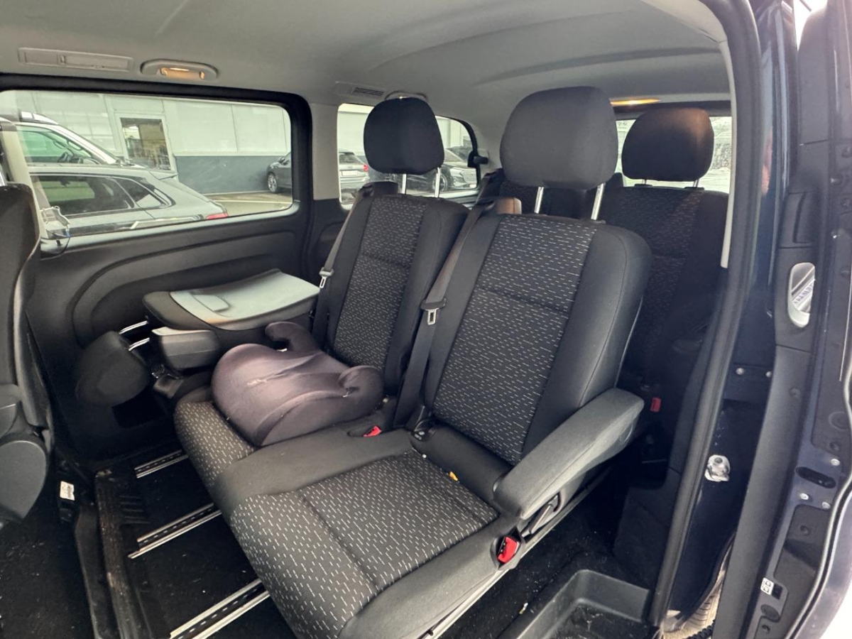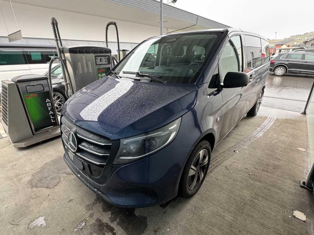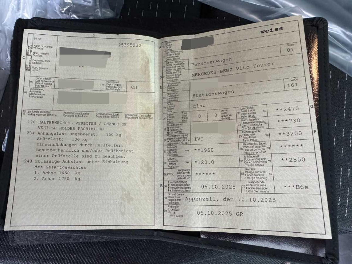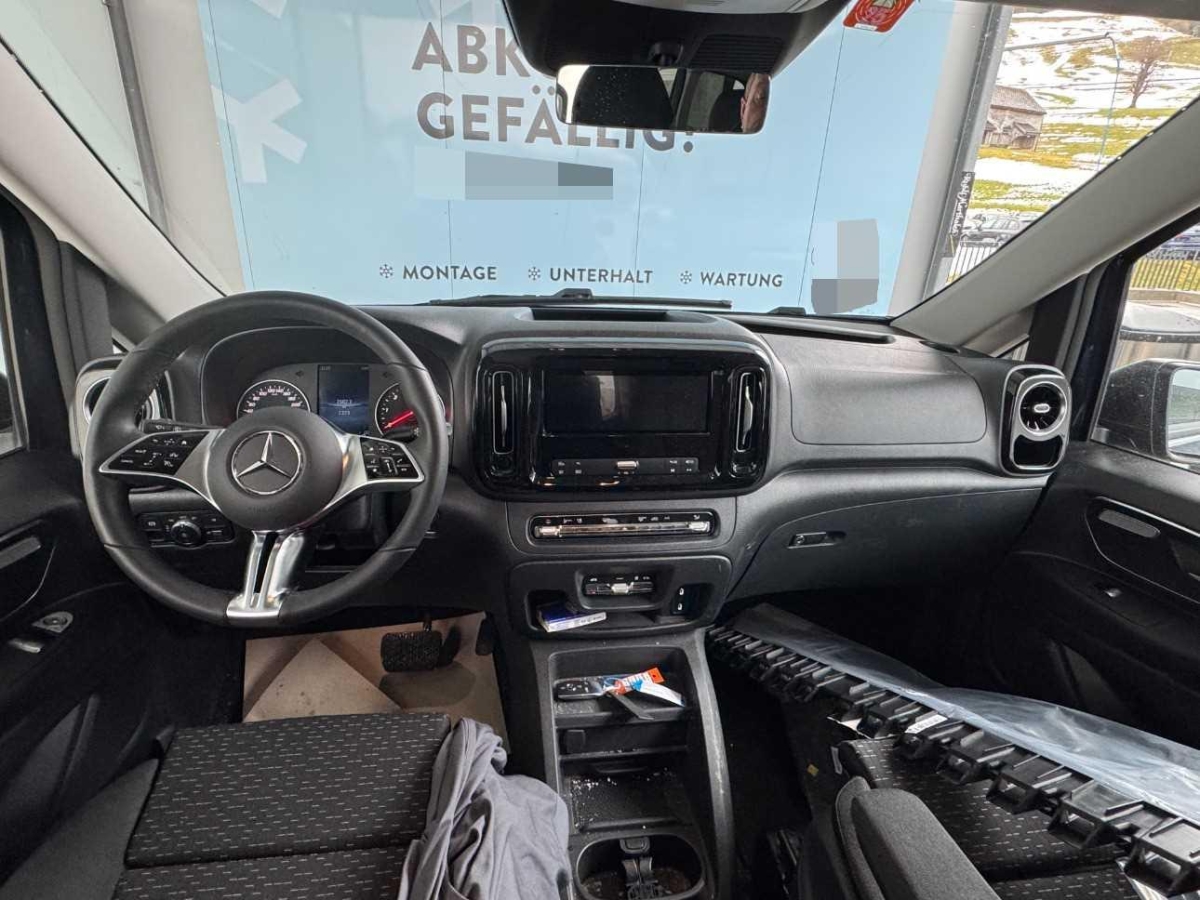 Sitze: Komfort-Fahrersitz, Assist: Feststellbremse elektrisch, Media: Vorrüstung Navigation, Beleuchtete Spiegel für Sonnenblenden, Assist: Traktionskontrolle, Wartungsintervall 40.000 km, Emissionsklasse Euro 6e RDE5 M/N1 GR. II, Paket: Spiegel-Paket Vito, Elektronisches Stabilitäts-Programm (ESP), Sitze: Lordosenstütze Beifahrersitz, Sitze: Armlehnen für Bestuhlung im Fahrgastraum, Aussenspiegel elektrisch heranklappbar, Modellpflege, AEJ X4/2, Innenspiegel automatisch abblendbar, Assist: ATTENTION ASSIST, Komfortschliessung, Lenkrad: Lenkrad in Neigung und Höhe verstellbar, Assist: Intelligenter Geschwindigkeits-Assistent, Media: Digitales Radio (DAB), Räder: Sommerreifen, Sitze: Sitzkissentiefenverstellung Beifahrer, Gewichtsvariante 3.100 kg, Lenkrad: Multifunktionslenkrad, Media: Kommunikationsmodul (LTE) für digitale Dienste, Airbag: Windowbags für Fahrer und Beifahrer, Änderungsjahr G4-II, Aussenspiegel heizbar und elektrisch verstellbar, Wärmedämmendes Glas rundum, Türen: Heckklappe, Antiblockiersystem (ABS), Türen: Aktiver Feststeller Schiebetür, Media: MBUX Multimediasystem, Media: Kombiinstrument mit Farbdisplay, Media: 2-Wege-Lautsprecher vorn und hinten, Haltegriffe für Einstieg, Vliesbatterie 12 V/92 Ah, Türen: Kindersicherung an Türen im Fahrgastraum, Beleuchtung im Haltegriff Fond mit Lesespot, Sitze: Sitzkissentiefenverstellung Fahrer, Teppichboden im Fahrzeuginnenraum vorne, Assist: Tempomat, Fenster vorn rechts, fest in Seitenwand/Schiebetür, Motor: OM 654 DE 20 LA 120 kW (163 PS) 3800/min, Licht: Ausstiegsleuchten, Elektrik für Anhängersteckdose, Assist: Aktiver Bremssassistent, Assist: Aktiver Spurhalte-Assistent, Haupttank 70 Liter, Sitze: 3er-Sitzbank Komfort 2.Reihe, äusserer Sitz klappb ., Sitze: Sitzschienen mit Schnellverriegelung, 3 Schienen, Nachtbeleuchtung Fond, Räder: Leichtmetallräder 7 J x 17, 5-Doppelspeichen-Design, Fahrwerk: Allradantrieb permanent, Paket: Park-Paket mit Rückfahrkamera, Geschwindigkeitsbegrenzung 210 km/h, Räder: Bereifung 225/55 R17, Fahrwerk: Basisfahrwerk, Assist: Updates Intelligenter Geschwindigkeits-Assistent, Media: Vorrüstung Remote Services Plus, Licht: Umfeldbeleuchtung Heckklappe, Tourer SELECT, Fahrzeug HVO fähig, Sitze: Lordosenstütze Fahrersitz, Dekor: Dachverkleidung, Licht: Adaptives Bremslicht, Komfort-Dachbedieneinheit, Lackierung: Uni-Lackierung, Getriebe: 9G-TRONIC, Beleuchtung für Fussraum vorne, Abschliessbares Handschuhfach, ECO Start-Stopp-Funktion, Assist: Berganfahrhilfe, Licht: MULTIBEAM LED mit Fernlichtassistent PLUS, Airbag: Thorax-Pelvis-Sidebag Beifahrer, Lenkrad: Lederlenkrad, Klima: Halbautomatisch geregelt Klimaanlage TEMPMATIC, Zentralverriegelung mit Fernbedienung, Licht: Fahrlichtassistent, Zwei Cupholder, Assist: Totwinkel-Assistent, Stossfänger und Anbauteile in Wagenfarbe, Aerodynamik-Paket, Assist: Pannenmanagement, Warndreieck, Haltegriffe für Einstieg Fahrer und Beifahrer, Paket: Akustikpaket, Dekor:Teppichboden im Fond, Fenster fest hinten, Dekor: Innenverkleidung gehobene Ausführung, Media: Smartphone-Integrationspaket, Sitze: 3er-Sitzbank Komfort 1.Reihe, äusserer Sitz klappb., Warmluftkanal zum Fahrgastraum, Airbag: Airbag Beifahrer, Paket: Chrom Interieur-Paket, Assist: HOLD-Funktion, Generator 14 V / 250 A, Licht: Innen- und Umfeldbeleuchtung Kombi, Fenster vorn links, fest in Seitenwand/Schiebetür, Kühlergrill verchromt, Steuercode Zertifizierung II, Fenster in Heckklappe mit Wisch-/Waschanlage, Haltegriff im Fond, Servolenkung geschwindigkeitsabhängig, Assist: Mercedes-Benz Notrufsystem, Assist: Kindererkennung im Fahrzeug passiv, Fehlbetankungsschutz, Sitze: Komfort-Beifahrersitz, Räder: Reifendrucküberwachung an VA u. HA, drahtlos, Komfortbereifung, Airbag: Thorax-Pelvis-Sidebag Fahrer, Zuheizer elektrisch, Licht: Schluss-, Brems- und Blinklicht in LED-Technik, Polster: Stoff Caluma schwarz