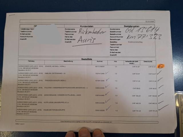 | Sonderausstattung: | 3630 CHF | Reparaturkosten: | 12463 CHF |