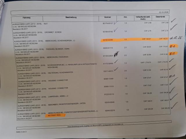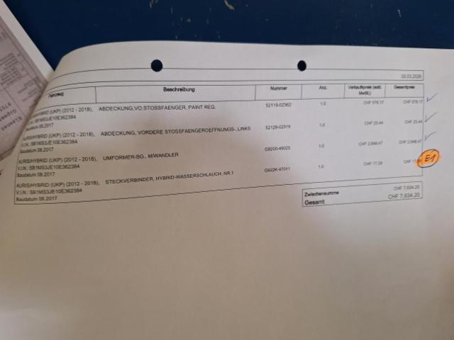 Wichtige HinweiseZustandFahrzeug ist fahrbar. Bereifung Fahrzeug wird mit Winterräder abgegeben. Sonstiges Fahrzeugdokumente vorhanden. Schlüssel Beide Schlüssel vorhanden. BeschädigungenFront Front links eingedrückt. Motorhaube eingedrückt. Frontblech/Maskenblech eingedrückt. Radhaus vorne links eingedrückt / gestaucht. Elektrik Risiko Steuergeräte. Weitere Beschädigungen Risiko Konverter Hybridsystem AusstattungSerienaustattung Klimaautomat Airbag Fahrer und Beifahrerseite Elektronische Wegfahrsperre Elektrische Fensterheber vorne + hinten Aussenspiegel elektrisch verstellbar und heizbar Seitenairbag Fahrer und Beifahrerseite Nebelscheinwerfer Zentralverriegelung mit Fernbedienung Lederlenkrad Mittelarmlehne hinten Lenkrad verstellbar Kopfairbag vorne und hinten Audiofernbedienung am Lenkrad Bodenteppiche Stabilitätskontrolle VSC + Traktionskontrolle TRC Leichtmetallräder 16" Rückfahrkamera Knieairbag Fahrer Isofix-Kindersitzbefestigung hinten Dämmerungs-Sensor Rücksitzlehnen getrennt abklappbar 60:40 Reifendruck-Überwachungsanzeige Anschluss USB und AUX Reifen-Reparatur Set LED Tagfahrlicht ABS und EBD Elektr. Bremskraftverteilung inkl. BA Multi-Informationsdisplay Start + Stopp Automatik Fahrer- und Beifahrersitz verstellbar Keine Gewähr auf die Angaben der Serienausstattungen Fernlichtassistent inkl. Spurwechselwarnung Toyota Touch 2/ CD/ MP3/ Bluetooth/ DAB+ Verkehrsschild-Erkennungssystem Pre Collision System Gratis-Service 6 Jahre/ 60'000 km Sonderausstattung4 Winterräder Alu 16" Abgedunkelte Scheiben hinten Metallic- oder Mica Lackierung Pack Chrom Ausstattung Metallic-Lackierung |