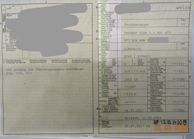 Wichtige HinweiseZustandFahrzeug ist rollbar. Bereifung Fahrzeug wird mit Winterräder abgegeben. Schlüssel Nur ein Schlüssel vorhanden. BeschädigungenLinks Linke Seite beschädigt. Front Front links eingedrückt. Kotflügel vorne links eingedrückt. Elektrik Risiko Steuergeräte. Weitere Beschädigungen Stossstange vorne, Vorschaltgerät Scheinwerfer AusstattungSerienaustattung Airbag Fahrer und Beifahrerseite Sitzheizung vorne Elektrische Fensterheber vorne + hinten Aussenspiegel elektrisch verstellbar und heizbar Seitenairbag Fahrer und Beifahrerseite Zentralverriegelung mit Fernbedienung Höhenverstellbarer Beifahrersitz Mittelarmlehne vorne ABS und EBV Elektr. Bremskraftverteilung Dachreling Alu Deaktivierung Beifahrerairbag ESP/ ASR Vorhangairbags vorne + hinten DSC Dynamische Stabilitäts-Control Zwei Zonen-Klimaautomatik Leichtmetallfelgen 19" Rückfahrkamera 12 V Steckdose 3x Elektronische Servolenkung Pack Visibilité Dieselpartikelfilter Isofix-Kindersitzbefestigung hinten Spurassistent Keyless Schliess- und Startsystem Höhenverstellbarer Fahrersitz Reifendruck-Sensoren RDS Seitenscheiben im Fond und Heckscheibe abgedunkelt Heckklappe elektrisch Elektrische Parkbremse Einparkhilfe hinten Schwarzes Dach Pedalerie in Aluminium Reifenreparatur-Kit Stop + Start System Einparkhilfe vorne LED Tagfahrlicht Aussenspiegel elektrisch einklappbar Sitzbank hinten 1/3 - 2/3 umklappbar Totwinkel-Assistent Keine Gewähr auf die Angaben der Serienausstattungen Lederlenkrad perforiert Radio/ MP3/ USB/ Bluetooth/ Fernbed. am Lenkrad DAB+ Digital Audio Broadcast LED-Nebelscheinwerfer Sitzbezüge in Alcantara/ Kunstleder Verkehrsschild-Erkennungssystem Mirror Link Navigationssystem/ Peugeot Connect I-Cockpit Amplify Garantie 3 Jahre/ 80'000 km Full LED Technology SonderausstattungMetallic-Lackierung |