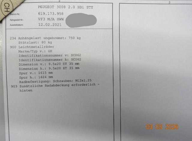 | VIN | VF3MJAHWWHS****** | Reifenprofil in %: | |