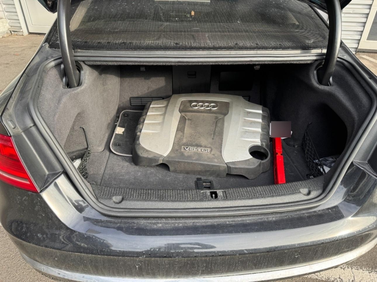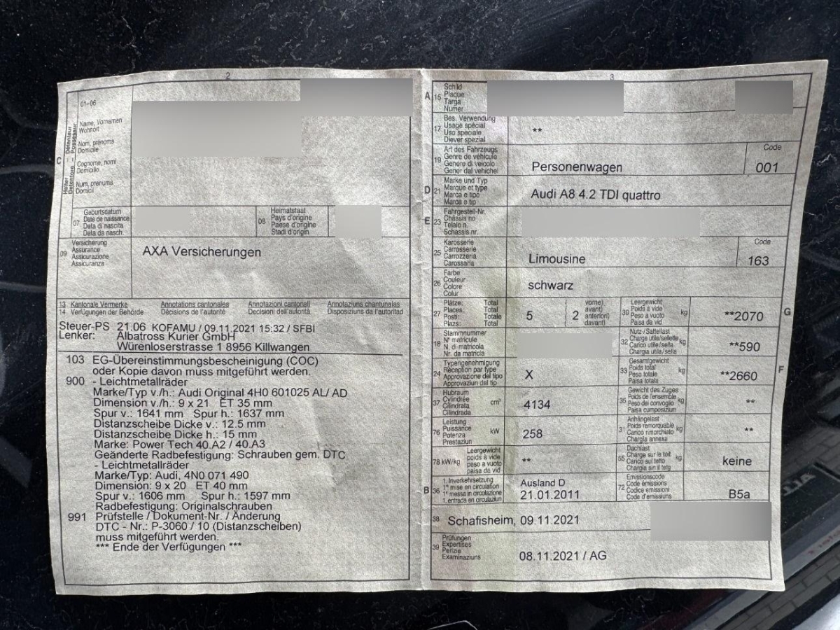 Klima: Pollenfilter (Staubfilter), Aschenbecher und Zigarettenanzünder, Schutzleisten in Wagenfarbe, Bi-Xenon-Scheinwerfer inkl. Reinigungsanlage, Scheibenwaschdüsen beheizt, Media: MMI Navigationssystem Plus, Radiovorbereitung, Scheibenantenne, Ent- störung und 8 LS, Geruchssensor, Aussentemperaturanzeige, Abblendlichtausschaltverzögerung 'Follow me home', Ausstiegsleuchten in den Türen, Elektronische Parkbremse, Sitze: Elektrisch einstellbare Lendenwirbelstütze für Vordersitze, Gurtstraffer vorne und hinten, Drehzahlmesser, Scheibenwischer vorne mit Intervall, Heckscheibenheizung, Beide Make up-Spiegel beleuchtet, Nebelscheinwerfer, Zentralverriegelung mit Fernbedienung, Adaptive air suspension: elektronisch geregelte Luftfederung, Räder: Reifendruck-Kontrollanzeige, Türgriffe aussen in Wagenfarbe, Mittelarmlehne vorn in Kunstleder schwarz mit Kontrastnaht in Rot, 3 Kopfstützen hinten, Servotronic, Garantie: 2 Jahre ohne Kilometerbegrenzung (ab 1. Inv.), Abschliessbare Radschrauben, Aussenspiegel rechts und links beheizt, elektrisch verstell- / und einklappbar, Audi Bluetooth Autotelefon ohne Hörer, Allradantrieb permanent, Servolenkung geschwindigkeitsabhängig, Getriebe: 8-Stufen-Automat sequentiell, Alu-Räder 8Jx18 7-Arm-Design, Licht: Nebelschlussleuchte, Licht: Tagfahrlicht, Airbag: Airbag Fahrer und Beifahrer, Multifunktions-Lederlenkrad 4-Speichen mit Schaltwippen, Innenspiegel automatisch abblendbar, Partikelfilter und Oxydationskatalysator, Elektronisches Stabilitäts-Programm (ESP), Wegfahrsperre elektronisch, Stossstangen und Aussenspiegel in Wagenfarbe, 3-Punkt-Sicherheitsgurte auf allen Plätzen, Assist: Bremsassistent (BAS), Bremsbelag-Verschleissanzeige, Innenlicht-Abschaltverzögerung, Digital Uhr, Holzapplikationen Nussbaum, Leseleuchten vorne, Assist: Park Distance Control vorne und hinten, Höhenverstellbare Gurten vorne, Sportdifferential hinten, Elektrische Fensterheber vorne + hinten, Elektronische Differentialsperre (EDS), Diebstahlwarnanlage mit Abschleppschutz, Elektrisch verstellbares Lenkrad, Airbag: Seitenairbags vorne und hinten, Radio-High, Antiblockiersystem (ABS), Erweiterte Aluminium-Optik, Aktive Kopfstützen, Sitze: Vordersitze heizbar, MMI basic, Licht: Drittes Bremslicht, Airbag: Window-Kopfairbags, Leseleuchten hinten, Teppichfussmatten vorne und hinten, ISOFIX Kindersitzvorrichtung, Antriebsschlupfregelung (ASR), Getönte Scheiben, Cupholder vorne und hinten, Media: Audi music interface, Leuchtweitenregulierung automatisch, Notrad, Tageskilometerzähler, Lichtwarnsummer