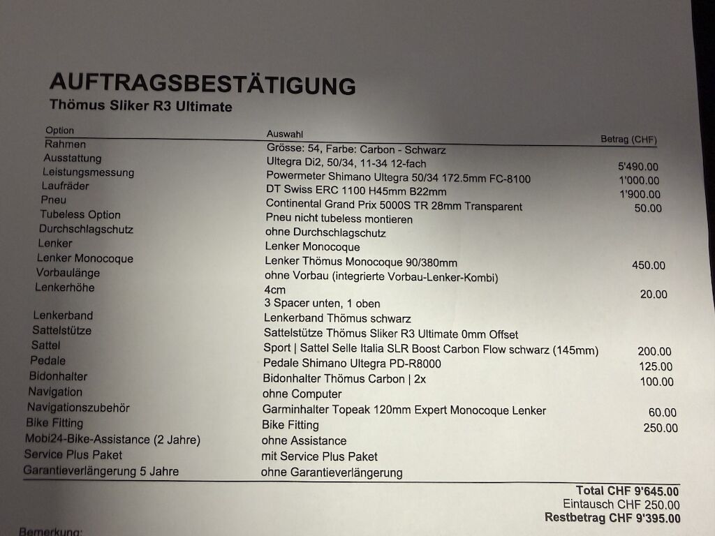 | Opis uszkodzen: | Kollision mit 40km/h zwischen Rennrad und Auto. Man sieht optischen keinen Schaden am Rahmen oder Gabel, die Firma Thömus Bikeworld empfiehlt den Carbonrahmen zu ersetzten. DT Swiss ERC Felge hinten ist beschädigt, Felge vorne lauft unrund, Powermeter Shimano Ultegra ist verkratzt. Neupreis im August 2025 war CHF 9395.-. Siehe Liste Komponenten! |