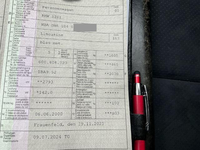 Wichtige HinweiseZustandFahrzeug ist NICHT fahrbar. Motor startet nicht, Ursache unbekannt. Bereifung Fahrzeug wird mit Winterräder abgegeben. Sonstiges Fahrzeugdokumente vorhanden. Schlüssel Nur ein Schlüssel vorhanden. BeschädigungenSonstige Schäden Div.Carrosserie Teile sind leicht beschädigt. AusstattungSerienaustattung Klimaanlage inkl. Mikrofilter Fahrer und Beifahrer-Airbag Lederlenkrad mit Airbag Seitenairbag für Fahrer und Beifahrer Beifahrer-Airbag ITS-Kopfairbag Radio/Tonband BMW Business RDS Aussenspiegel elektrisch verstellbar und heizbar Fernbedienung für Zentralverriegelung Bordcomputer inkl. Check-Control mit Piktogrammanzeige Nebelscheinwerfer vorne Automatische Stabilitäts-Control + Traktion Antiblockiersystem ABS Servolenkung Leichtmetallräder Stoff Flachgewebe Keine Gewähr auf die Angaben der Serienausstattungen SonderausstattungKlimaautomatik inkl. Mikrofilter Standheizung CD-Wechsler BMW CD 6 Selection HiFi-Aktiv-Lautsprechersystem Edelholzausführung Nussbaumwurzel Leder Montana inkl. Sitzheizung Skisack Sonnenschutzrollo für Heckscheibe elektrisch Armauflage vorn Schiebe-Hebedach elektrisch Xenon-Licht Blinkleuchten weiss Metallic-Lackierung Servotronic M-Sportfahrwerk Durchladesystem inkl. Skisack |