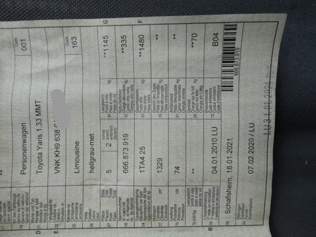 Wichtige HinweiseZustandFahrzeug ist rollbar. Schlüssel Nur ein Schlüssel vorhanden. Weitere wichtige Hinweise Motor läuft! BeschädigungenHeck Heck eingedrückt. Heckblech eingedrückt. Weitere Beschädigungen Stossstange hinten gebrochen, Stossstangenbalken hinten gestaucht, Rücklicht hinten rechts gebrochen, Seitenwand hinten rechts zerkratzt Vorschaden: Stossstange vorne gebrochen, Kotflügel vorne llinks verbeult, Seitenwand hinten links verbeult, Spiegelschale vorne rechts beschädig, Scweller rechts vorne eingedellt AusstattungSerienaustattung Klimaautomat Airbag Fahrer und Beifahrerseite Elektronische Wegfahrsperre Sitzheizung vorne Elektrische Fensterheber vorne + hinten Servolenkung Seitenairbag Fahrer und Beifahrerseite Nebelscheinwerfer Zentralverriegelung mit Fernbedienung Höhenverstellbarer Fahrersitz manuell Lederlenkrad Lenkrad verstellbar Kopfairbag vorne und hinten Gepäckraumabdeckung Deaktivierung Beifahrerairbag Audiofernbedienung am Lenkrad Isofix-Kindersitzbefestigung ABS und EBV Elektr. Bremskraftverteilung inkl. BA Stabilitätskontrolle VSC + Traktionskontrolle TRC Leichtmetallräder 15" Aussenspiegel in Wagenfarbe elektr. verstellbar und heizbar Einzeln abklappbare Rücksitzlehnen 60/40 Frontsitze mit Schleudertrauma-Schutzsystem WIL Knieairbag Fahrer Rücksitzbank verschiebbar Multi-Informationsdisplay/ Bordcomputer Smart entry-start/ Schliess- Startsystem Radio/ CD/ MP3/ Bluetooth Keine Gewähr auf die Angaben der Serienausstattungen SonderausstattungMetallic-/ Mica Lackierung |