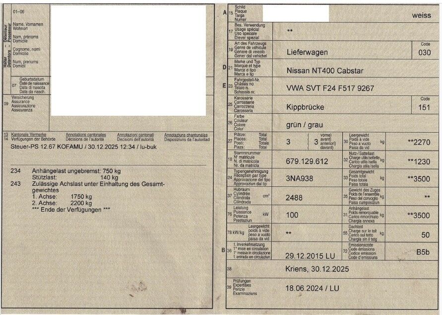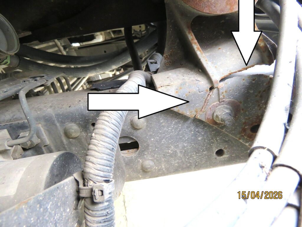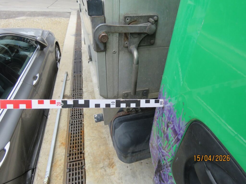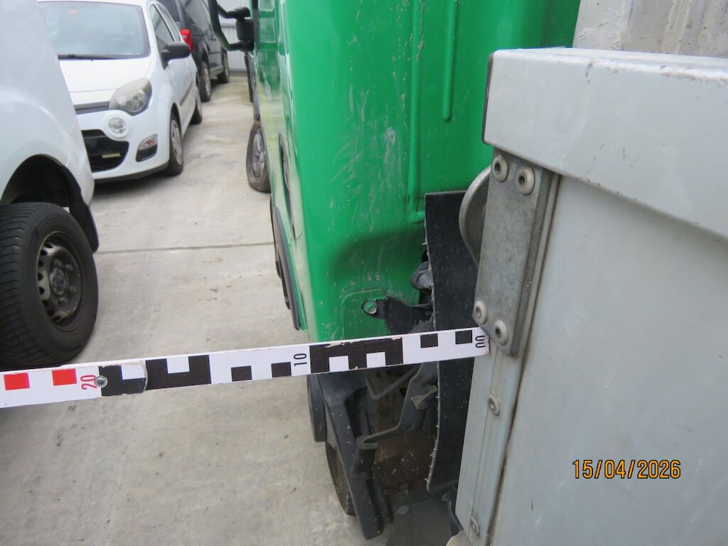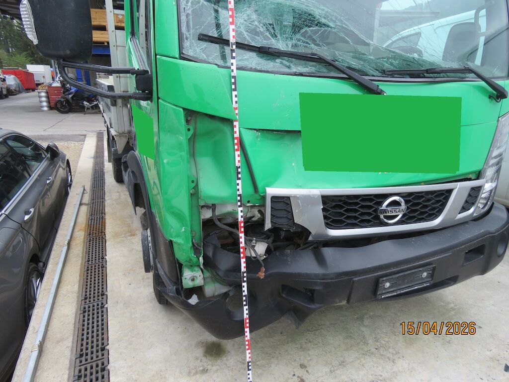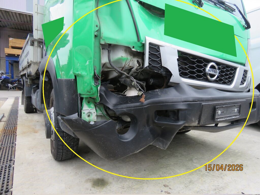 | Opis uszkodzen: | Kabine -Kabine ist verdreht, steht schräg auf dem Chassis -Frontgitter, Stosssfänger, Scheinwerfer und Nebellampe, Frontscheibe, A-Säulenabdeckung rechts, Radlaufabdeckung, Armaturenbrett im rechten Bereich rechts, Sicherungskasten gebrochen -Kabinenlagerung rechts gerissen -Frontblech, Kabinenboden, A-Säule rechts deformiert |