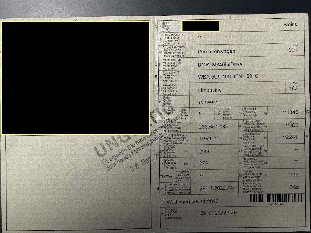 | Opis uszkodzen: | Stossfänger vorne, Scheinwerfer rechts, Kotflügel rechts und Motorhaube rechts eingedrückt; Felge, Reifen und Radaufhängung vorne rechts beschädigt; Reifen und Felge hinten rechts beschädigt; Türe vorne und hinten links Kratzer |