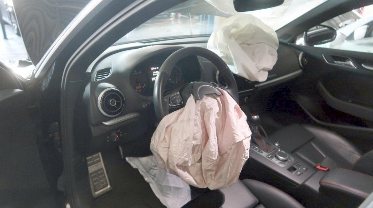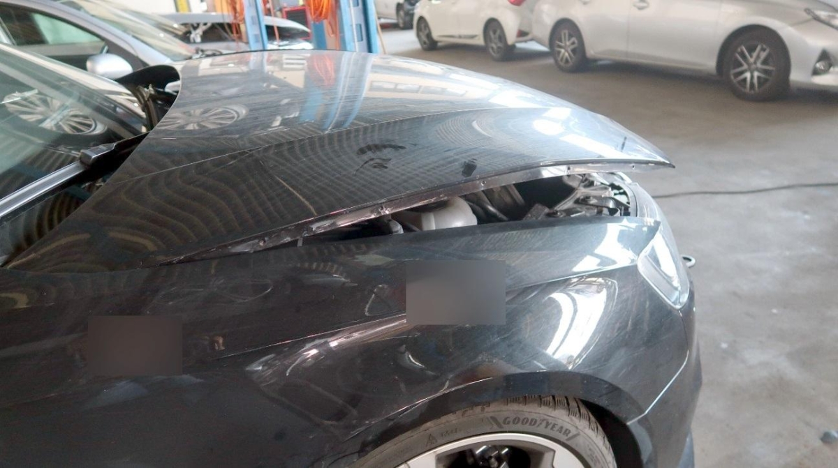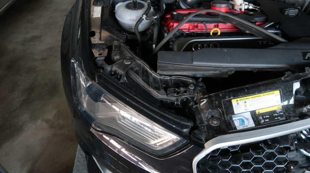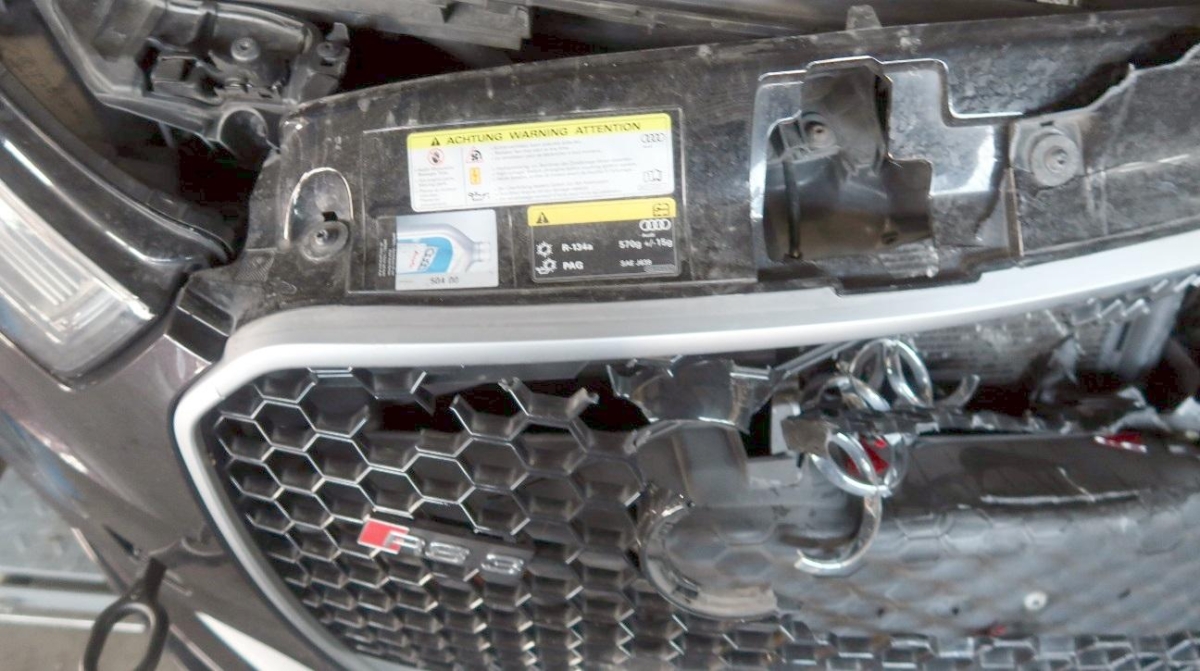 Airbag ausgelöst, Aussenspiegel links, Aussenspiegel rechts, Federbein vorne links, Front, Gurtstraffer ausgelöst, Klimakühler, Kotflügel links, Kotflügel rechts, Kühler, Kühlgitter, Längsträger vorne links, Längsträger vorne rechts, Motorhaube, Rad vorne links, Radaufhängung vorne links, Radhaus vorne links, Scheinwerfer links, Scheinwerfer rechts, Schlossträger, Stosstange vorne, Türe vorne links
