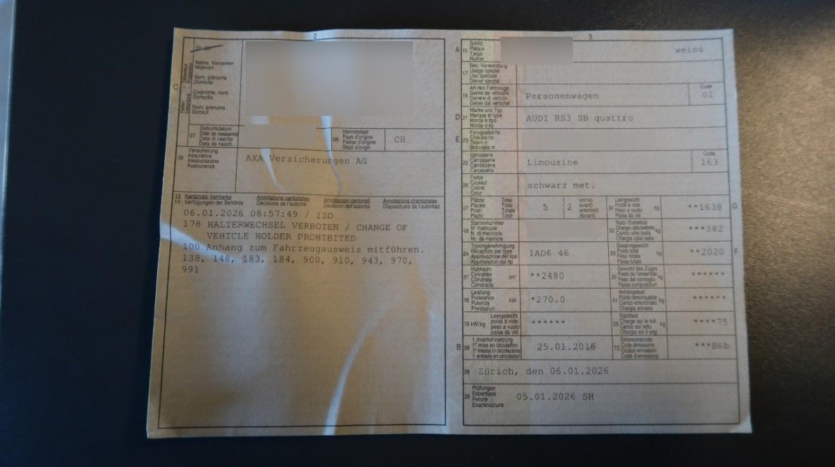 | Fahrzeugausweis | Vorhanden |