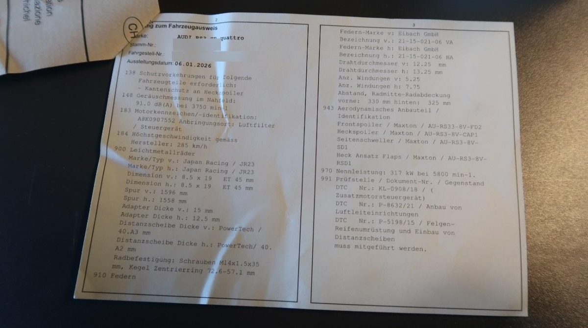 Räder: Reifendruck-Kontrollanzeige, Multifunktions-Sportlenkrad in Leder, unten abgeflacht Tiptronic, mit Schaltwippen, Lenkrad: Lenkrad längs- und höhenverstellbar, Sequentielles 7-Gang-Getriebe mit Automatikfunktion, Windschutzscheibe mit Colorstreifen am oberen Rand, Airbag: Airbag Fahrer und Beifahrer, Ablagenpaket, Dynamiklenkung, Licht: Nebelschlussleuchte, Dekoreinlagen in 3D-Optik, Schutzleisten in Wagenfarbe, Elektronisches Stabilitäts-Programm (ESP), Antiblockiersystem (ABS), Katalysator geregelt, Türgriffe aussen in Wagenfarbe, Fahrwerk: RS Sportfahrwerk, Licht: Drittes Bremslicht, Tempomat, Make up-Spiegel links, Kreuzstützen für Vordersitze elektrisch verstellbar, Diebstahlwarnanlage mit Innenraum- überwachung und Abschleppschutz, Scheinwerfer-Waschanlage, Mittelarmlehne vorn in Kunstleder schwarz mit Kontrastnaht in Rot, Bi-Xenon-Scheinwerfer inkl. Reinigungsanlage, Klima: Pollenfilter (Staubfilter), Beide Make up-Spiegel beleuchtet, Aussenspiegel in Alu, Automatisches Einschalten der Abblendlichter, Media: Digitaler Radioempfang (DAB), Licht: LED Heckleuchten, Räder: Reifenreparatur-Set (Tire Fit), Make up-Spiegel rechts, Höhenverstellbare Gurten vorne, 3-Punkt-Sicherheitsgurte auf allen Plätzen, Fahrer-Informationssystem mit Farbdisplay, Beifahrersitz höhenverstellbar, Aussenspiegel rechts und links beheizt, elektrisch verstell- / und einklappbar, blendfrei, Klimaautomatik Komfort, Rücksitzlehne geteilt abklappbar, Seitenaufprall-Schutzsystem, Licht: Licht- und Regensensor, Polster: Leder Feinnappa, Allradantrieb permanent, Garantie: 2 Jahre ohne Kilometerbegrenzung (ab 1. Inv.), Sitze: Sportsitze vorne, Sitze: Vordersitze heizbar, Media: Audi Sound System, Frontscheibe mit Color-Band, Stossstangen in Wagenfarbe, Gurtstraffer vorne, MMI Radio, Audi drive select, Raucherpaket, Seitenairbag für Fahrer und Beifahrer, Innenraumlicht-Paket, Alu-Räder 19J 5-Arm-Rotor Design