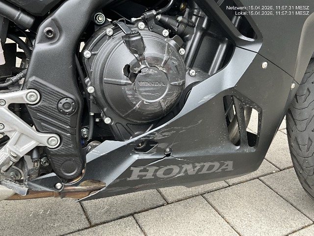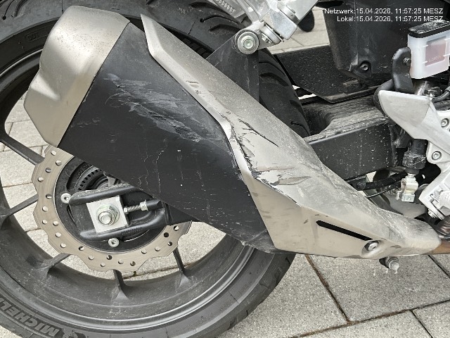 | Schadensbeschreibung | Beschreibung der Schäden: Seitenschaden rechts : Auspuff, Bremshelbel und Fussraster deformiert und zerkratzt. Motorgehäuse und Seitenverkleidung vorne gebrochen und zerkratzt. Seitenschaden links : Lenker und Schalthebel deformiert. Beide Blinker und Fussraster gebrochen. Seitenverkleidungen, Aussenspiegel, Lenkergewicht, Bremsgriff, Motorgehäuse und Schwinge zerkratzt. Vorbestandene Schäden: |