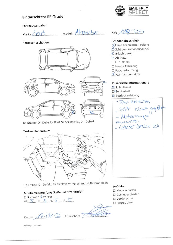| eine Gewähr auf die Angaben der Sonder- und Serienausstattung / keine mechanische Prüfung. Fahrzeug wurde unzerlegt expertisiert / keine Haftung für allfällige, nach Demontage bekanntwerdenden Mängel. Fahrzeugbereifung und Ausstattung gemäss Fotos / Fahrzeugkauf auf eigenes Risiko ab Platz ohne Nachwährschaft - Div. Dellen und Kratzer am gesamten Fahrzeug. - Motorlampe leuchtet, Ursache unbekannt. - Letzter Service 2024 | |