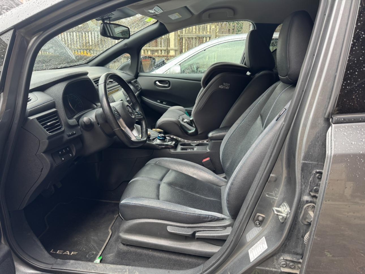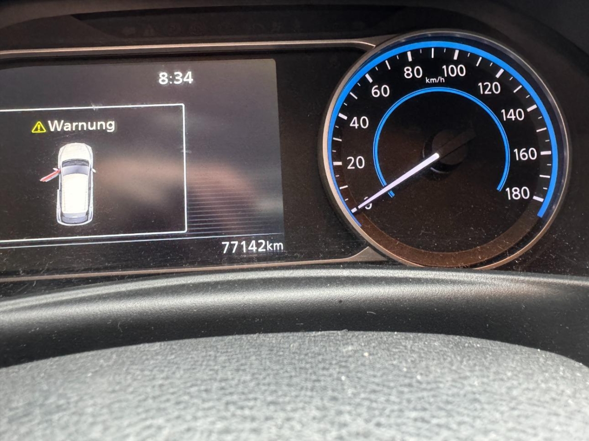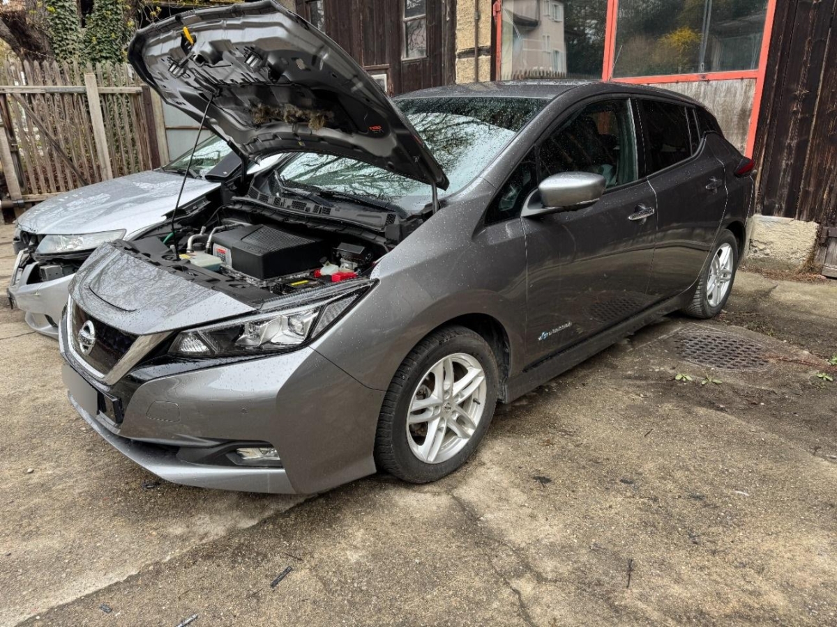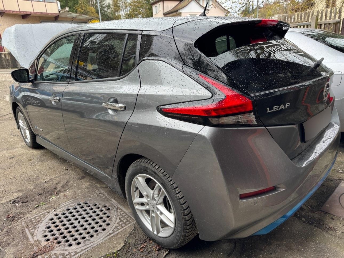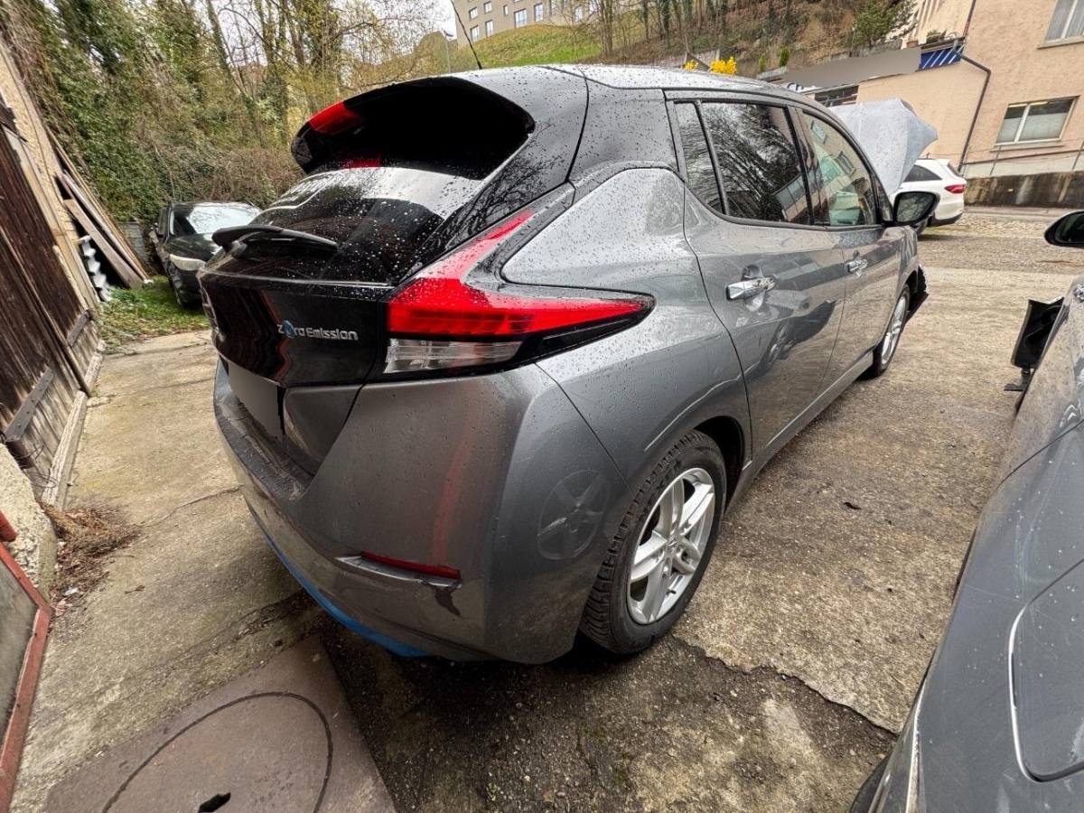 Pollenfilter (Staubfilter), Mittelkonsole mit Ablagefach, Akustisches Warnsignal bei nicht angelegtem Sicherheitsgurt, Lederlenkrad, EVSE-Kabel (Mode2-Sicherheitssystem) mit Haushalts-Stecker, Reserverad, Assistenzpaket inklusive Stau-und Notfallassistent und Side Assist, Assist: Start-/Stopp-Automatik, LED Scheinwerfer, Lenkrad: Lenkrad beheizbar, Mode 3 Ladekabel Typ 1 / Typ 2, Scheibenwischer vorne und hinten mit Intervall, Beide Make up-Spiegel beleuchtet, Ladeanschluss für Wechselstrom bis 6.6kW, Drittes Bremslicht, Assist: Regensensor für Scheibenwischer vorne, Elektrische Fensterheber vorne + hinten, Bremsassistent (BAS), Nebelscheinwerfer, Assist: Warnblinkautomatik bei Vollbremsung, Media: Connected / Android Auto / Apple CarPlay, Aussenspiegel rechts und links beheizt, elektrisch verstell- / und einklappbar, Räder: 4 Leichtmetallfelgen 17J mit Pneu, Berganfahrhilfe, Querverkehrsassistent hinten, Wegfahrsperre elektronisch, Sitze: Fahrersitz höhenverstellbar, Bluetooth Freisprecheinrichtung, Ambientebeleuchtung, INTELLIGENT KEY Entriegelungsmöglichkeit der Abdeckung der Ladeanschlüsse, Keyless Entry und Starten des Motors, Notbremsassistent, Zentralverriegelung mit Fernbedienung, Licht: LED-Tagfahrlicht, Verdunkelte Seitenscheiben ab B-Säule, Kopfstützen hinten höhenverstellbar, Sprachsteuerung, ABS, EBD elektronische Bremskraftverteilung, Frontscheibe Wärme- und UV-absorbierend, Servolenkung, Elektronische Parkbremse, Aussentemperaturanzeige, Sitze: Rücksitzbank asymetrisch geteilt umlegbar, Dachantenne, Assist: Einparkhilfe vorne und hinten, Velours-/Leder-Ausstattung, Ladeanschluss für Gleichstrom bis 50kW, Audiosystem, Ablagen in den Türen, Innenspiegel automatisch abblendbar, Sitze: ISOFIX-Befestigungspunkte für Kindersitz an den äusseren Rücksitzen, Adaptiver Tempomat ACC, Lenkrad: Lenkradfernbedienung, Akustisches Annäherungssignal intermittierend, nach vorne abstrahlend, bis 30 km/h, Licht: Fernlicht-Assistent, Klimatisierungsautomatik, Airbag: Airbag Fahrer und Beifahrer, Cupholder vorne und hinten, Steckdose 12V, Totwinkel-Assistent, Umgebungsausleuchtung (Follow me home), Verkehrszeichenerkennung, Nebelschlussleuchte, Assist: Spurhalteassistent, Kofferraumbeleuchtung, Blinker in Aussenspiegel, 3-Punkt-Sicherheitsgurte auf allen Plätzen, Info-Display, Gurtstraffer mit Gurtkraftbegrenzer vorne, Heckscheibenheizung, Beleuchtetes Handschuhfach, LED Heckleuchten, NissanConnect EV: Multimedia System, EV Telematiksystem, NissanConnect EV App, Müdigkeitserkennung, Lenkrad höhenverstellbar, Seitenairbags vorne und Kopfairbags vorne und hinten, Kopfstützen vorne höhenverstellbar, Licht- und Regensensor, Aussenspiegel in Wagenfarbe, Kartentaschen an den Rückenlehnen, TPMS Reifendrucküberwachungssystem, Elektronisches Stabilitäts-Programm (ESP), Türaussengriffe in Chromoptik, Media: AROUND VIEW MONITOR für 360° Rundumsicht, Sitzheizung vorne und hinten, Stufenloser Automat, Assist: Fussgängererkennung, Start-/Stop-Knopf