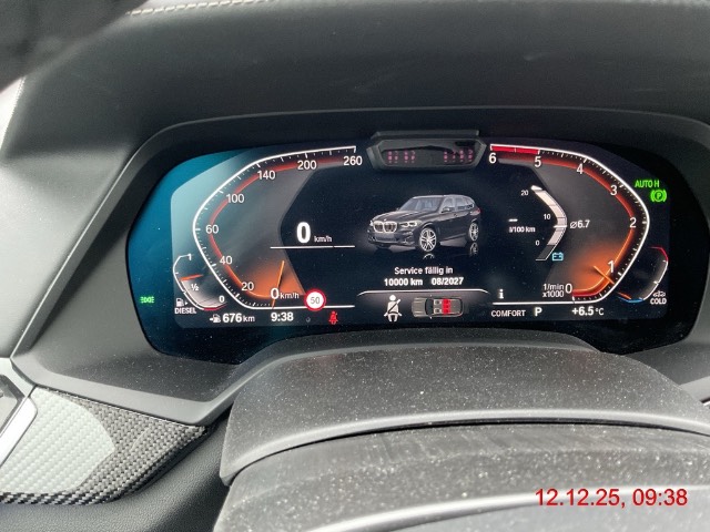 M Sportabgasanlage X5 M spezifische Abgasanlage, Räder: 21" M Leichtmetallräder Y-Speiche 741 M Bicolor Orbitgrau, glanzgedreht, mit Mischbereifung und Notlaufeigenschaften Vorn: 9,5 J×21/Bereifung 275/40 R 21 Hinten: 10,5 J×21/Bereifung 315/35 R 21, Active Protection Sicherheitspaket zur Einleitung von Schutzmassnahmen für die Insassen in drohenden Unfallsituationen: - Reversible Gurtstraffung - Automatisches Schliessen der Fenster bis auf einen Spalt - Ausstattungsabhängig Schliessen des Panoramadaches, M Hochglanz Shadow Line mit erweiterten Umfängen Ausstattungsumfänge in Schwarz Hochglanz: - Nierenrahmen - Nierenstäbe - Air Breather - Endohrblenden, Dekor: Interieurleisten Carbon Fibre, Travel & Comfort System - 2×USB Typ C, Laden mit 3 A in der Rückenlehne der 1. Sitzreihe - 2×Vorbereitungen Multifunktionshalter in der Rückenlehne der 1. Sitzreihe, BMW Head-Up Display - Vollfarbige Projektion fahrrelevanter und situationsspezifischer Informationen auf die Windschutzscheibe., M Sportbremse, rot hochglänzend, BMW Display Key Schlüssel-Masse: ca. 90×55×15 mm Funktionsumfänge: - LCD-Farbdisplay inkl. Touchbedienfeld - Anzeigemöglichkeit von Fahrzeug-Statusinformationen (z. B. Reichweite, Service-Hinweise, Fahrzeug-Verriegelung etc.) - Regulation der Temperatur im Fahrzeuginneren - Bedienmöglichkeit der Standheizung (in Verbindung mit SA 536 Standheizung) - Höhenverstellung des Fahrzeuges von aussen - Kabelloses Laden des Schlüssels - Zusätzliches USB-Ladekabel - Funktionelle Reichweite: 300 m, Fahrwerk: Adaptive 2-Achs Luftfederung Mit automatischer Niveauregulierung: - Manuelle Höherstellung bis 30 km/h um 40 mm (30/55 km/h um 20 mm) - Automatische Absenkung ab ca. 140 km/h um 10 mm (ab ca. 200 km/h um 20 mm) - Gesamter Höhenverstellweg 80 mm über Kippschalter in Mittelkonsole auf fünf Niveaus anwählbar - Ansteuerung der Höhenniveaus von ausserhalb des Fahrzeugs (nur in Verbindung mit SA BMW Display Key) - Fahrzeug absenkbar (für Beladung) über Schalter in Heckklappe, Klima: Klimatisierungsautomatik 4- Zonen, Anhängerkupplung - Betätigungsschalter im Gepäckraum. Elektronisch einschwenkbare Anhängerkupplung. Kann vollständig unter die Heckschürze eingeschwenkt werden. Inklusive Anhänger-Stabilisierungskontrolle., Media: harman/kardon Surround Sound-System - Digitaler Verstärker mit individuell einstellbarem Equalizing, 464 W Verstärkerleistung, 9 Kanäle. Lautsprecherblenden mit harman/kardon-Schriftzug, 16 Lautsprecher., Modellschriftzug, Entfall, Klima: Standheizung - Individuelles Temperieren des Fahrgastraums mittels Heizgerät bei kälteren Temperaturen ohne Inbetriebnahme des Motors - Inklusive Standlüftung bei wärmeren Temperaturen für einen kühleren Innenraum - Die Standheizung enthält im Lieferumfang die SA BMW Display Key, Integral-Aktivlenkung - Anpassung des Lenkwinkels der Hinterräder verbunden mit geringerem Lenkaufwand für ein agileres und in Parksituationen komfortableres Fahrverhalten. Hinterachse mitlenkend, Akustikverglasung - Verwendung von verstärkten Verbundglasscheiben für die Seitenscheiben - Verstärkung der Frontscheibe von 4,5 mm auf 5 mm - Gesteigerter Fahrkomfort durch Reduzierung der Aussengeräusche, Sitze: Komfortsitze vorn, elektrisch verstellbar, Dekor: BMW Individual Instrumententafel lederbezogen - Instrumententafel oben und Türbrüstungen in Leder Walknappa Schwarz mit Nahtbild - Instrumententafel unten in Weltfarbe, Assist: Parking Assistant Plus, Integrierte Universal Fernbedienung - Zur Fernsteuerung von elektrischen Toren, BMW Gestiksteuerung - Spezifisch festgelegte Funktionen können im Erkennungsbereich oberhalb der vorderen Mittelkonsole durch Gestik per Hand gesteuert werden., BMW Garantie: BMW Gewährleistungsverlängerung - 4 Jahre/200000 km (es gilt das zuerst Erreichte), Sitze: Sitzheizung vorne und hinten, Lackierung: Metallic-Lackierung, Sonnenschutzverglasung - Stärker eingefärbte Verglasung ab der B-Säule im hinteren Fahrzeugbereich, Panorama-Glasdach, Gepäckraumtrennnetz, Sitze: Massagefunktion vorn - Acht Massageprogramme in jeweils drei Intensitätsstufen zur Muskelaktivierung und -entspannung, Assist: Driving Assistant Professional, Dekor: Glasapplikation CraftedClarity für Interieurelemente Handgefertigte geschliffene Kristall-Glaselemente: - Wählhebel mit beleuchtetem «X» Symbol - iDrive Controller - Start Stopp Knopf, Komfortzugang - Schlüsselloser Zugang zum Fahrzeug - Welcome Inszenierung bei Annäherung ans Fahrzeug - Automatische Entriegelung bei Annäherung ans Fahrzeug (in Fahrzeugrichtung) - Automatische Verriegelung beim Entfernen vom Fahrzeug - Berührungsloses Öffnen und Schliessen der Heckklappe Beinhaltet den BMW Digital Key mit folgenden Funktionen: - Ver- und Entriegeln sowie Starten des Fahrzeugs unter Verwendung eines kompatiblen Smartphon. - Key Card mit NFC-Techn. - Einen zusätzlich digita. Schlüssel