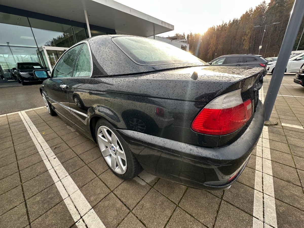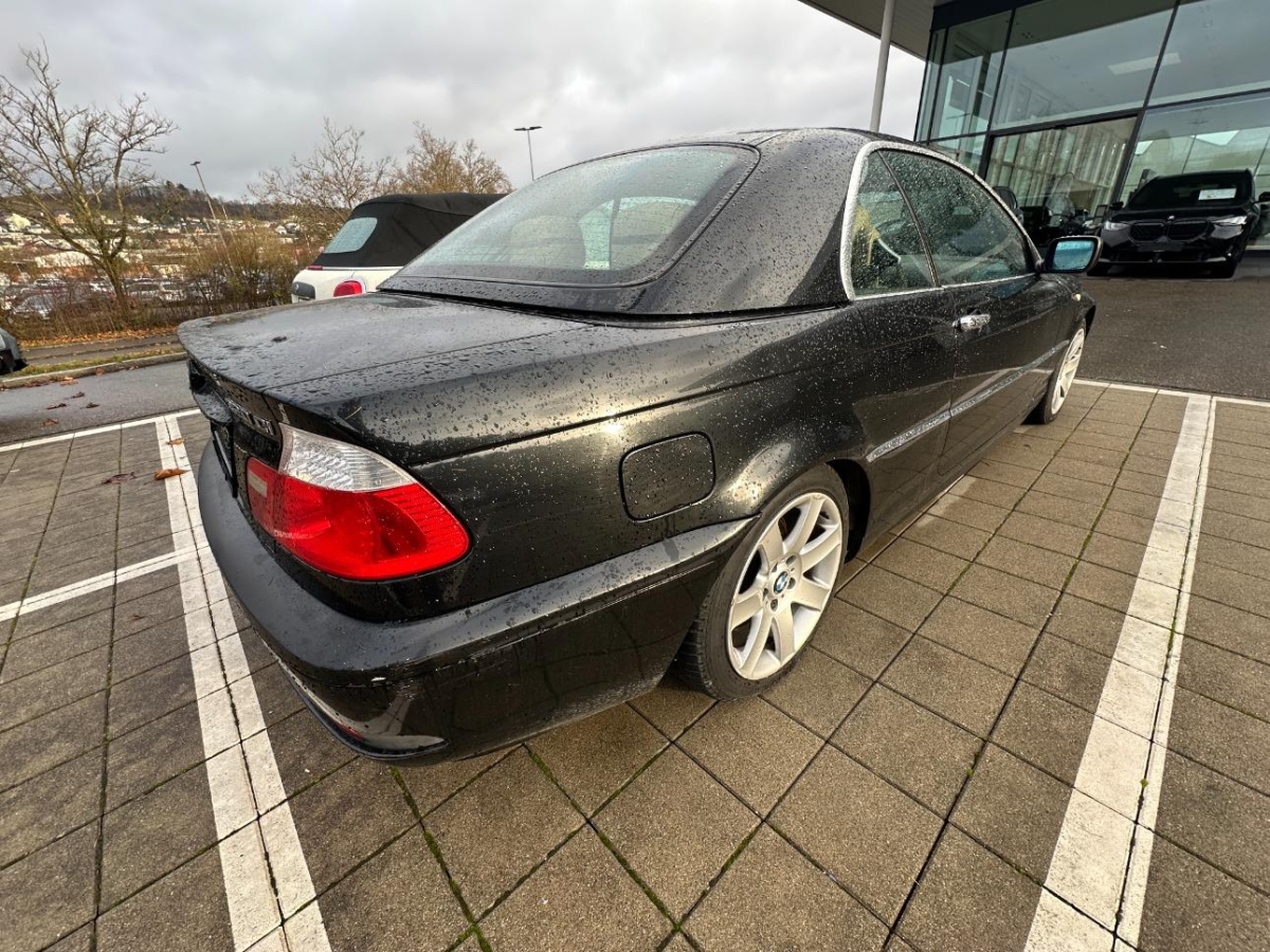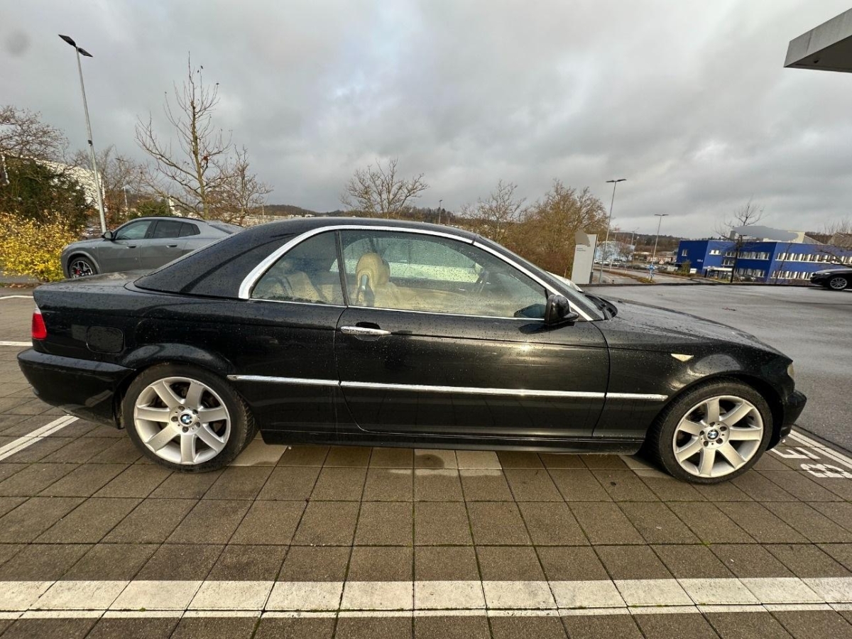 Sportlenkrad und Schalthebelgriff in, Dynamische Stabilitätskontrolle (DSC), Elektrische Fensterheber vorne + hinten, Seitenschutz-Zierleisten, Nebelscheinwerfer, Wegfahrsperre elektronisch, Stossstangen und Aussenspiegel in Wagenfarbe, Tageskilometerzähler, Oelstandsanzeige, Drittes Bremslicht, Höhenverstellbare Gurten vorne, Beleuchtetes und abschliessbares Handschuhfach, Mittelarmlehne hinten, Zentralverriegelung mit Fernbedienung, Grün getönte Scheiben, Elektronische Differentialsperre (ADB), Beide Make up-Spiegel beleuchtet, Lenkrad: Lenkrad längs- und höhenverstellbar, Scheibenwischer vorne mit Intervall, Zweiklanghorn, Automatische Stabilitäts- und Traktions- kontrolle, Scheibenwaschdüsen beheizt, Bremsassistent (BAS), Pollenfilter (Staubfilter), Mittelkonsole mit Ablagefach, Licht: Nebelschlussleuchte, Katalysator geregelt, Lichtwarnsummer, Antiblockiersystem (ABS), Ecometer, Aussenspiegel rechts und links beheizt und elektrisch verstellbar, asphärisch gewölbtes Spiegelglas, Gepäcknetze an beiden Vordersitzen, Bordcomputer, Digital Uhr, Leseleuchten vorne, Innenraumlicht-Paket, Überrollschutzsystem, Check-Control-System, 4 Leichtmetallfelgen im Ellipsoid- styling 46 16J mit Pneu, Bavaria C Reverse RDS mit Antenne, Ent- störung und 4/6 LS, Kopfstützen hinten, Aussentemperaturanzeige, Innenlicht-Abschaltverzögerung, Vordersitze höhenverstellbar, Airbag: Airbag Fahrer und Beifahrer, Vordersitze elektrisch verstellbar, Spezielle Stoff-Ausstattung, Wartungsintervall-Anzeige, Wassertemperaturanzeige, Vollautomatisches Verdeck, Klimatisierungsautomatik, Lenkung, elektrisch unterstützt, Drehzahlmesser, Seitenairbags, Assist: Cornering Brake Control (CBC), 5-Gang-Getriebe, ISOFIX Kindersitzvorrichtung, Gurtstraffer vorne, Applikationen glänzend, Lackierung: Uni-Lackierung, Leuchtweitenregulierung elektrisch