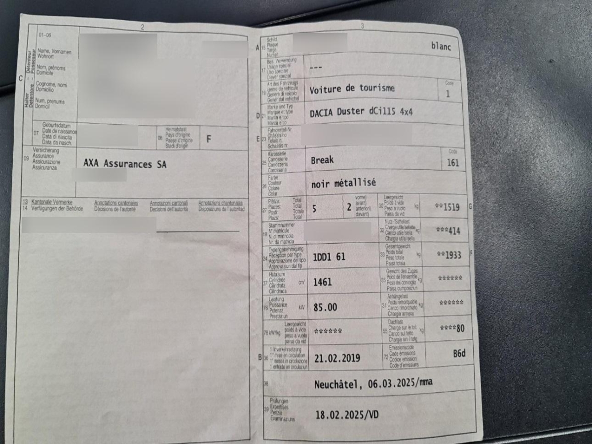 Elektronisches Stabilitäts-Programm (ESP), Lenkrad längs- und höhenverstellbar, Garantie: Dacia Garantie: 6 Jahre Durchrostungsgarantie (ab 1. Inv.), Seitenairbag für Fahrer und Beifahrer, Sonnenblende rechts, Fahrersitz höhenverstellbar, Kopfstützen hinten höhenverstellbar, Eco-Modus, Tempomat, Elektrische Fensterheber vorne + hinten, Türgriffe aussen in Wagenfarbe, Geschwindigkeitsbegrenzer, Nebelscheinwerfer, Pollenfilter (Staubfilter), Heckscheibenheizung, Kopfstützen vorne höhenverstellbar, Garantie: Dacia Garantie: 2 Jahre Lackgarantie (ab 1. Inv.), Assist: Notbremsassistent, Wegfahrsperre elektronisch, Servolenkung elektrisch, Garantie: 3 Jahre oder 100'000 km (ab 1. Inv.), Automatische Türverriegelung geschwindigkeitsabhängig, Laderaumbeleuchtung, Stopp-/Start-System, Licht: Drittes Bremslicht, Klimaanlage, Räder: Reifenreparatur-Kit, Radio MP3 DAB+, USB, AUX, Bluetooth, Lenkradbedienung, Assist: Antriebsschlupfregelung (ASR), Innenraumbeleuchtung, Airbag: Airbag Beifahrer deaktivierbar, Partikelfilter und Oxydationskatalysator, Einparkhilfe hinten, Sitze: Rücksitzlehne geteilt abklappbar, Hill-Start Assist (HSA), Media: Radiovorbereitung und Entstörung, Allradantrieb permanent, Höhenverstellbare Gurten vorne, 3 Kopfstützen hinten, Licht: Automatisches Einschalten der Abblendlichter, 3-Punkt-Sicherheitsgurte auf allen Plätzen, Lackierung: Bleu Navy, Stossfänger vorne und hinten schwarz, Antiblockiersystem (ABS), Lederlenkrad, Aussenspiegel rechts und links beheizbar und elektrisch verstellbar, Getönte Scheiben, Zentralverriegelung mit Fernbedienung, Nebelschlussleuchte, Türverkleidung mit Stoffeinsätzen, Licht: Kofferraumbeleuchtung, Airbag: Airbag Fahrer und Beifahrer, Hill Descent Control (HDC), Bordcomputer, Licht: Tagfahrlicht, Polster: Stoff-Ausstattung, Getriebe: 6-Gang-Getriebe, ISOFIX-Kindersitzbefestigung auf den hinteren Aussenplätzen, Sonnenblende links, 4 Leichtmetallfelgen 17J mit Reifen, Assist: Totwinkelassistent, Rückfahrkamera, Interieurdesign, Media-Nav DAB+ (Navigationssystem + Radio + Telefon) und Lenkradbedienung, Getönte Scheiben hinten