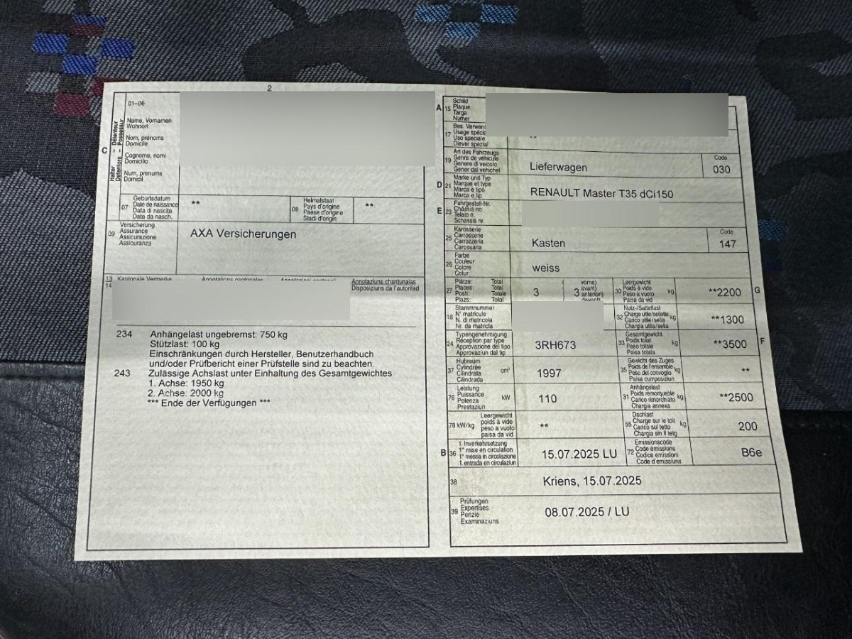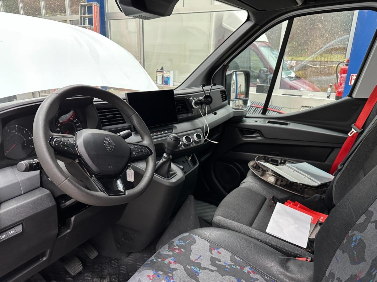 Garantie: Renault Garantie 6 Jahre Durchrostungsgarantie, Ablagefächer im Armaturenbrett und in den Türen, Umbaucode 2 für Euro6e ein max. Leergewicht im betriesbereiten Zustand bis 2740 kg, kein Aussenaufbau gestattet, Garantie: Ranault Garantie 3 Jahre Lackgarantie, Dekor: Innenraumharmonie schwarz, Wegfahrsperre elektronisch, Befestigungsösen am Laderaumboden, Räder: Radzierblenden mittel, Assist: Spurhalteassistent mit Lenkeingriff, Aussenspiegel elektrisch einstell- und beheizbar, Start/Stop-Funktion / Energy Smart Management, Laderaumbeleuchtung, Media: Open R-Link mit 10-Zoll Display (ohne Navigation), Sitze: Fahrersitz 6-fach verstellbar, Getriebe: 9-Gang Automatikgetriebe, Seitenwand links ohne Fenster, 3-Knopf-Schlüssel, Servolenkung, Licht- und Regensensor, Assist: E-Call Notrufsystem, Lenkrad: Höhenverstellbares Lenkrad, Klima: Heizung und Lüftung, Licht: LED Tagfahrlicht, Zentralverriegelung der Türen mit Fernbedienung, Assist: Anti-blockiersystem (ABS) mit Notbremsassistent und Bremskraftverteilung, Assist: Intelligenter Geschwindigkeitsassistent (ISA), Assist: Alkohol Interlock Vorverkabelung und Installationsanleitung, Assist: Tempomat mit Geschwindigkeitsbegrenzer, Türen: Schiebetür rechts, verblecht, Lackierung: Matt-Lackierung Blanc Minéral, Türen: Hecktüren 180°, verblecht, 3-Punkt-Sicherheitsgurte vorne mit Gurtkraftbegrenzer, Gurtwarner und Gurtstraffer, Airbag: Fahrerairbag, Sitze: Beifahrer-Doppelsitzbank, Assist: Einparkhilfe hinten, Räder: Reifenreparatur-Kit, Assist: Elektronisches Stabilitätsprogramm (ESC) mit Extended Grip, Berganfahrhilfe, Anhänger Stabilisator,Seitenwind Assistent + Antriebsschlupfregelung (ASR), Assist: Müdigkeits- und Aufmerksamkeitswarner, 12-Volt-Steckdose im Armaturenbrett, Räder: 16" Stahlfelgen 205/75 R16, Elektrische Fensterheber vorne, Räder: Reifendruckkontrollsystem, Assist: Aktiver Notbremsassistent mit City-Funktion und mit Fussgänger-/Radfahrererkennung, Haltegriffe im Laderaum, Handschuhfach offen, Licht: Lichteinschaltsensor, Trennwand, verblecht, Polster: Stoff-Ausstattung, Garantie: Renault Garantie 3 Jahre oder 100'000 km (was zuerst eintritt), Bordcomputer monochrome 3,5 Zoll