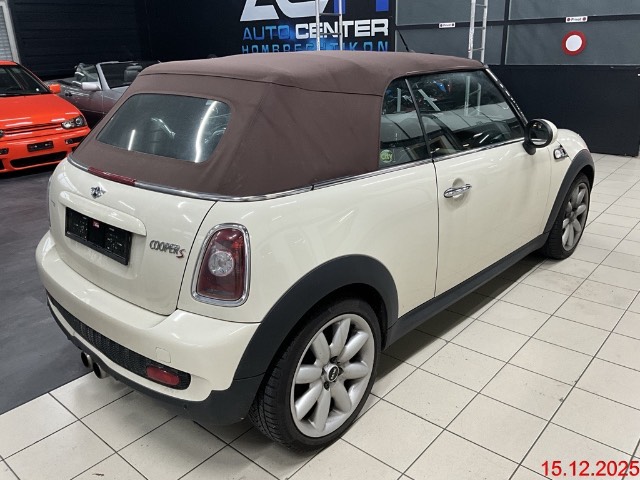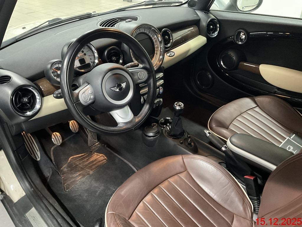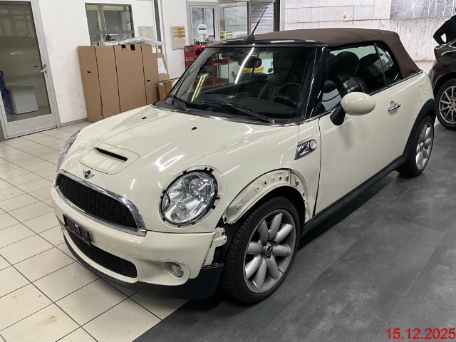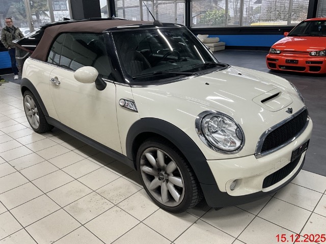 Verchromtes Auspuffendrohr, Getriebe: 6-Gang-Getriebe, Pollenfilter (Staubfilter), Wassertemperaturanzeige, Heckscheibenheizung, Reifenreparatur-Set (Tire Fit), Vollautomatisches Verdeck, Bremsassistent (BAS), Dynamische Stabilitätskontrolle (DSC), Licht: Halogenscheinwerfer, Leichtmetallräder S-Winder, 16J, Türgriffe aussen verchromt, Lackierung: Uni-Lackierung, Radio MINI CD, Auto Start-/Stop-Anlage, Lederlenkrad, Cupholder, Lichtwarnsummer, Antiblockiersystem (ABS), Mittelkonsole, Sitze: Rücksitzlehne geteilt abklappbar, Cornering Brake Control (CBC), Sonnenblende Fahrer und Beifahrerseite mit beleuchtetem Spiegel, Überrollschutzsystem, Wegfahrsperre elektronisch, Aussenspiegel in Wagenfarbe, Licht: Nebelschlussleuchte, Wartungsintervall-Anzeige, Verdeck schwarz, Zentralverriegelung mit Fernbedienung, Bremsbelag-Verschleissanzeige, ISOFIX Kindersitzvorrichtung, 3-Punkt-Sicherheitsgurte auf allen Plätzen, Seitenairbags, Drittes Bremslicht, Elektrische Fensterheber vorne + hinten mit Komfortschliessung, Lenkrad: Servolenkung, Airbag: Airbag Fahrer und Beifahrer, Drehzahlmesser, Erweiterte Dekorumfänge, Fahrersitz höhenverstellbar, Abschliessbares Handschuhfach, Park Distance Control (PDC), Abschliessbare Radschrauben, Licht: Tagfahrlicht, Kopfstützen hinten, Scheibenwischer vorne mit Intervall, AUX-Anschluss, Lenkrad höhenverstellbar, Tageskilometerzähler, Katalysator geregelt, Innenspiegel abblendbar, Leseleuchten vorne, Leuchtweitenregulierung von innen, Höhenverstellbare Gurten vorne, Automatische Stabilitäts- und Traktions- kontrolle, Polster: Stoff-Ausstattung, Licht: Abblendlichtausschaltverzögerung 'Follow me home'