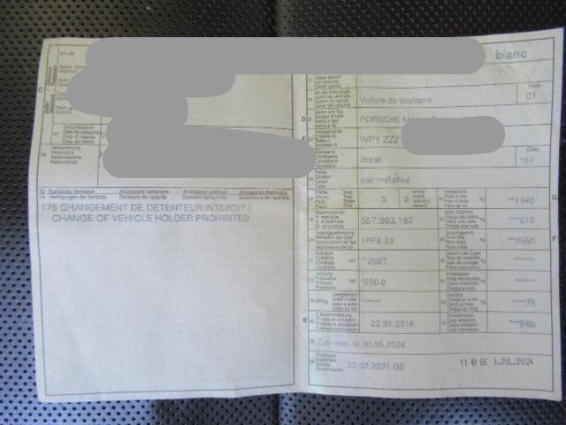 Wichtige HinweiseDemontagePersönliche Gegenstände oder Ladegut im Fahrzeug werden entfernt. Zustand Fahrzeug muss transportiert werden [Höhe und Breite beachten]. Fahrzeug ist NICHT fahrbar. Fahrzeug ist NICHT rollbar. Fahrzeug ist teilweise ausgebrannt. Fahrzeug weist äusserlich Brandspuren auf. Fahrzeug weist im Innenraum Brandspuren auf. Bereifung Fahrzeug wird mit Winterräder abgegeben. Sonstiges Fahrzeugdokumente vorhanden. Schlüssel Nur ein Schlüssel vorhanden. Hersteller- und Gewährleistungsbedingungen Die Fahrzeuggarantie oder Gewährleistung wird möglicherweise nicht vom Hersteller fortgeführt Weitere wichtige Hinweise Der Motor springt an. BeschädigungenMotor Risiko Motor. Risiko Getriebe. Risiko Differenzial. Beschädigungen Motorstörung: Warnleuchte aktiv Elektrik Risiko Steuergeräte. Kabelstränge verbrannt, beschädigt, abgerissen. Innenraum Armaturenbrett ist beschädigt. Gurtstraffer ausgelöst. Gurtstraffer vorne ausgelöst. Gurtstraffer hinten ausgelöst. Dachhimmel gerissen. Innenraum ungepflegt. Sitz vorne links defekt. Sitz vorne rechts defekt. Sitzpolster haben Brandlöcher. Starke Verschmutzung im Innenraum. Unangenehme Geruchsentwicklung im Innenraum [z.B. Treibstoff, Lebensmittel, Rauch, etc.] Feuchtigkeitsschaden Innenraum Glas Windschutzscheibe ist gerissen. Heckscheibe ist zerbrochen / beschädigt. Türscheibe vorne rechts ist zerbrochen / beschädigt. Türscheibe vorne links ist zerbrochen / beschädigt. Türscheibe hinten rechts ist zerbrochen / beschädigt. Türscheibe hinten links ist zerbrochen / beschädigt. Seitenscheibe hinten rechts ist zerbrochen / beschädigt. Seitenscheibe hinten links ist zerbrochen / beschädigt. Glasdach beschädigt. Dach Schiebedach/Aufstelldach defekt. Unterboden Unterboden stark verschmutzt. Sonstige Schäden Div.Carrosserie Teile sind leicht beschädigt. Div. Roststellen am Fahrzeug. Lackierung matt [stumpf, beschädigt]. Fahrzeug stand im Wasser. AusstattungSerienaustattung Airbag Fahrer und Beifahrerseite Elektrische Fensterheber vorne + hinten ABS Antiblockiersystem Nebelscheinwerfer Zentralverriegelung mit Fernbedienung Scheibenwischer mit Regensensor Reifendruck-Kontrollsystem RDK Aussenspiegel elektrisch verstellbar/ heizbar und anklappbar Zwei Zonen-Klimaautomatik ESP/ ASR/ MSR Vorhangairbags Seitenairbags vorne Tempomat mit Geschwindigkeitsbegrenzer Multifunktions-Lederlenkrad 3-Speichen Armauflage vorn Pack Interieur Komfortsitze elektrisch vorn Spurverlassenswarnung Rücksitze geteilt umklappbar 40/20/40 Heckklappe automatisches öffnen/ schliessen Universelle Schnittstelle Start + Stopp Funktion Keine Gewähr auf die Angaben der Serienausstattungen Audiosystem CDR Plus SonderausstattungSitzheizung vorne Metallic-Lackierung Luftfederung + Niveauregulierung Panoramadach elektrisch Fussmatten Dachhimmel Alcantara Dachreling Alu Edelholzausführung Nussbaumwurzel Bose Surround Sound -System Porsche Entry & Drive Seitenairbags hinten Scheinwerfer Reinigungsanlage Aussenspiegel und Innenspiegel automatisch abblendend Pack Ablage Active Suspension Management PASM Pack Licht-Komfort Radnabenabdeckung Naturlederausstattung Park-Distanz-Sensor vorne + hinten/ Rückfahrkamera Telefonmodul für PCM Aktive Sitzbelüftung vorn Abstandsregeltempomat Porsche Communication Management PCM Pack Komfort-Memory Geräusch- und Wärmeschutzverglasung Leichtmetallräder 20" RS Spyder Aktiver Spurhalteassistent LKAS Kompass Anzeige Servolenkung Plus Bi-Xenon-Scheinwerfer inkl. Dynamic Light System DAB+ Digital Audio Broadcast Online-Dienste Dynamic Light System Plus [PDLS Plus] Tempolimitanzeige Sideblades Seite 3 von www.swisscrashcars.ch 10.04.2026 17.37 6 Auktion Nr. 335437 Swiss Crash Cars |