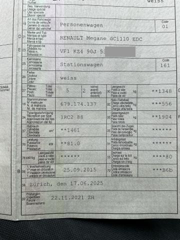 Wichtige HinweiseDemontagePersönliche Gegenstände oder Ladegut im Fahrzeug werden entfernt. Zustand Fahrzeug muss transportiert werden [Höhe und Breite beachten]. Fahrzeug ist NICHT rollbar. Motor startet nicht, Ursache unbekannt. Sonstiges Fahrzeugdokumente vorhanden. BeschädigungenFront Front rechts eingedrückt. Frontblech/Maskenblech eingedrückt. Radhaus vorne rechts eingedrückt / gestaucht. Innenraum Starke Verschmutzung im Innenraum. Sonstige Schäden Div.Carrosserie Teile sind leicht beschädigt. AusstattungSerienaustattung Airbag Fahrer und Beifahrerseite Zentralverriegelung Aussenspiegel elektrisch verstellbar und heizbar Bordcomputer Dachreling Seitenairbag Fahrer und Beifahrerseite Höhenverstellbarer Fahrersitz manuell Geteilte Rücksitzlehne 1/3, 2/3 Lederlenkrad Lenkrad verstellbar Elektrische Fensterheber hinten ABS und EBV Elektr. Bremskraftverteilung Elektrische Fensterheber vorne Reifendruck-Kontrollsystem RDK Leichtmetallfelgen 16" Deaktivierung Beifahrerairbag Lendenwirbelstütze Fahrersitz Bremsassistent EBA Isofix-Kindersitzbefestigung Zusatztönung der hinteren Scheiben Windowbags vorne + hinten Zwei Zonen-Klimaautomatik Tempomat mit Geschwindigkeitsbegrenzer Nebelscheinwerfer vorne Regen- und Lichtsensor Dieselpartikelfilter Elektrische variable Servolenkung HSA Berganfahrassistent Reifen-Pannenset Renault Chipkarte Keyless Einparkhilfe hinten Radio/ CD/ MP3/ Bluetooth LED Tagfahrlicht Aussenspiegel elektrisch einklappbar Keine Gewähr auf die Angaben der Serienausstattungen ASR und ESC/ Antriebsschlupf- und Stabilitätsprogramm SonderausstattungPack Easy |