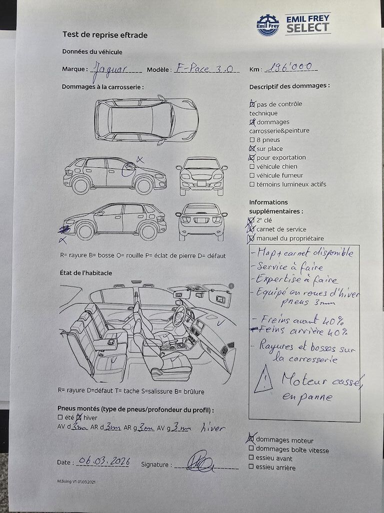 | 2 keys Map + notebook available Service maintenance to be done Expertise to be done Equipped with winter wheels 3 mm tires Front brakes 40 % Rear brakes 40 % SCRATCHES AND DENTS ON THE BODY ENGINE BREAK DOWN 2 clés Map + carnet disponible Service à faire Expertise à faire Equipé en roues d'hiver pneus 3 mm Freins avant 40 % Freins arrière 40 % RAYURES ET BOSSES SUR LA CARROSSERIE MOTEUR CASSER EN PANNE | |