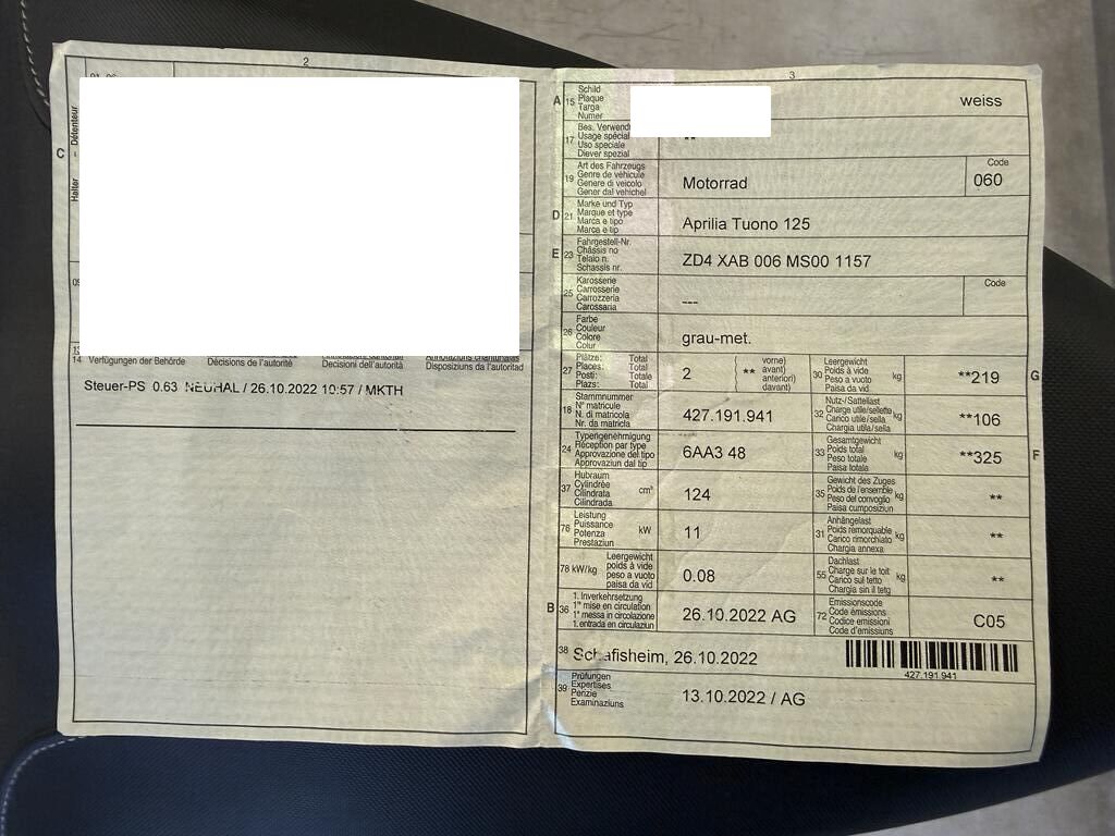 | Opis uszkodzen: | Anprall - Seite rechts: - Aussenspiegel und Lenkerende verkratzt - Bremshebel abgebrochen - Diverse Seitenverkleidungen aufgeschürft - Fussrastenanlage abgebrochen - Bremspedal deformiert - Lackbeschädigung an Rahmen (Bremspedal angestanden) - Heckverkleidung aufgeschürft - Fussraste hinten fehlt |